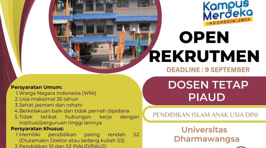 Deadline Pendaftaran: 9 September 2023 Medan — Universitas Dharmawangsa membuka kesempatan bagi putra-putri terbaik bangsa untuk bergabung sebagai Dosen Tetap Program Studi Pendidikan Islam Anak Usia Dini (PIAUD). Rekrutmen ini dibuka dalam rangka memperkuat kualitas sumber daya manusia serta meningkatkan mutu pendidikan di lingkungan Fakultas Agama Islam, khususnya Program Studi PIAUD. Proses penerimaan calon dosen ini terbuka bagi pelamar dengan kualifikasi akademik dan kompetensi yang sesuai dengan kebutuhan prodi, serta...Read More
